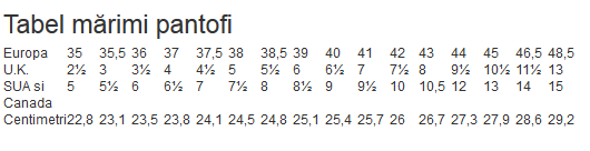 Tabel cu mărimi încalţaminte